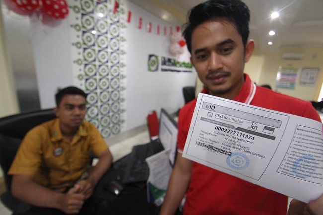 Man shows his son's JKN Card /ANTARA Foto