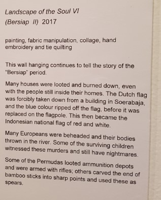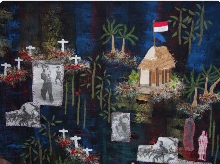 An exhibition of wall-hangings and mixed-media depicts the experiences of European Dutch and Eurasian people in Indonesia during the Japanese Occupation, the Revolution and after